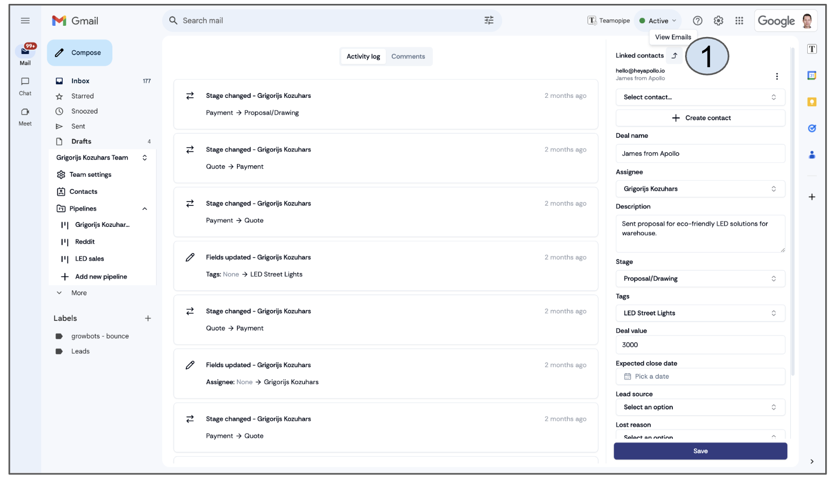 To view the full details of a deal, click on a card in the pipeline. This will open the deal details, where you'll find a changelog showing the history of all changes made to the deal. You can also add an unlimited number of comments to each deal. On the right side, you will see all the deal data and custom fields set up in the "Configure Pipeline" section (refer to slide 6 for more details).