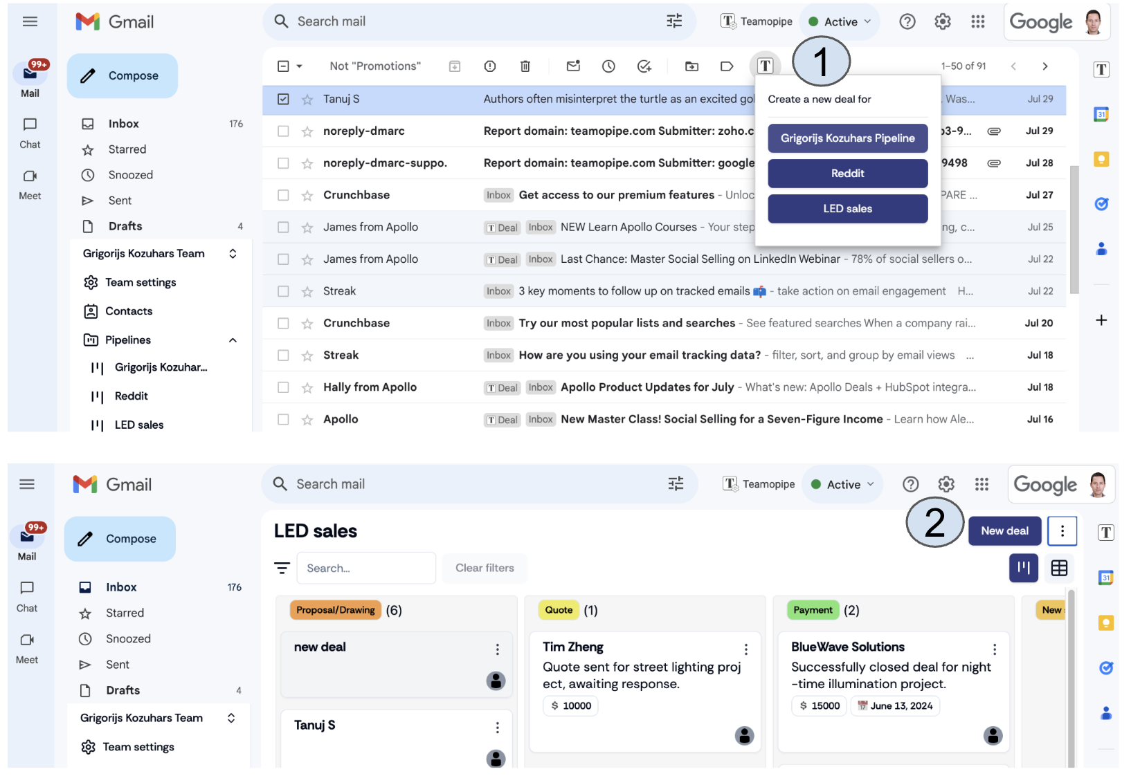 Select the email you wish to link to a new deal. A Teamopipe logo will appear in the top middle panel. Click on the logo and choose the pipeline where you would like to add the deal. After selecting the pipeline, a new deal will be created with empty fields. You can now fill in the necessary information and click Save.